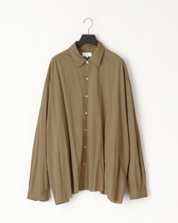 釦裏にブランド刻印を施しております。身幅をしっかりとったボックスシルエットが特徴。着用時のドレープなどは他にない雰囲気のシャツとなります。またサイズの切りっぱなし、芯地を極力仕様しないことで、生地の風合いのみでシルエットを構築しております。