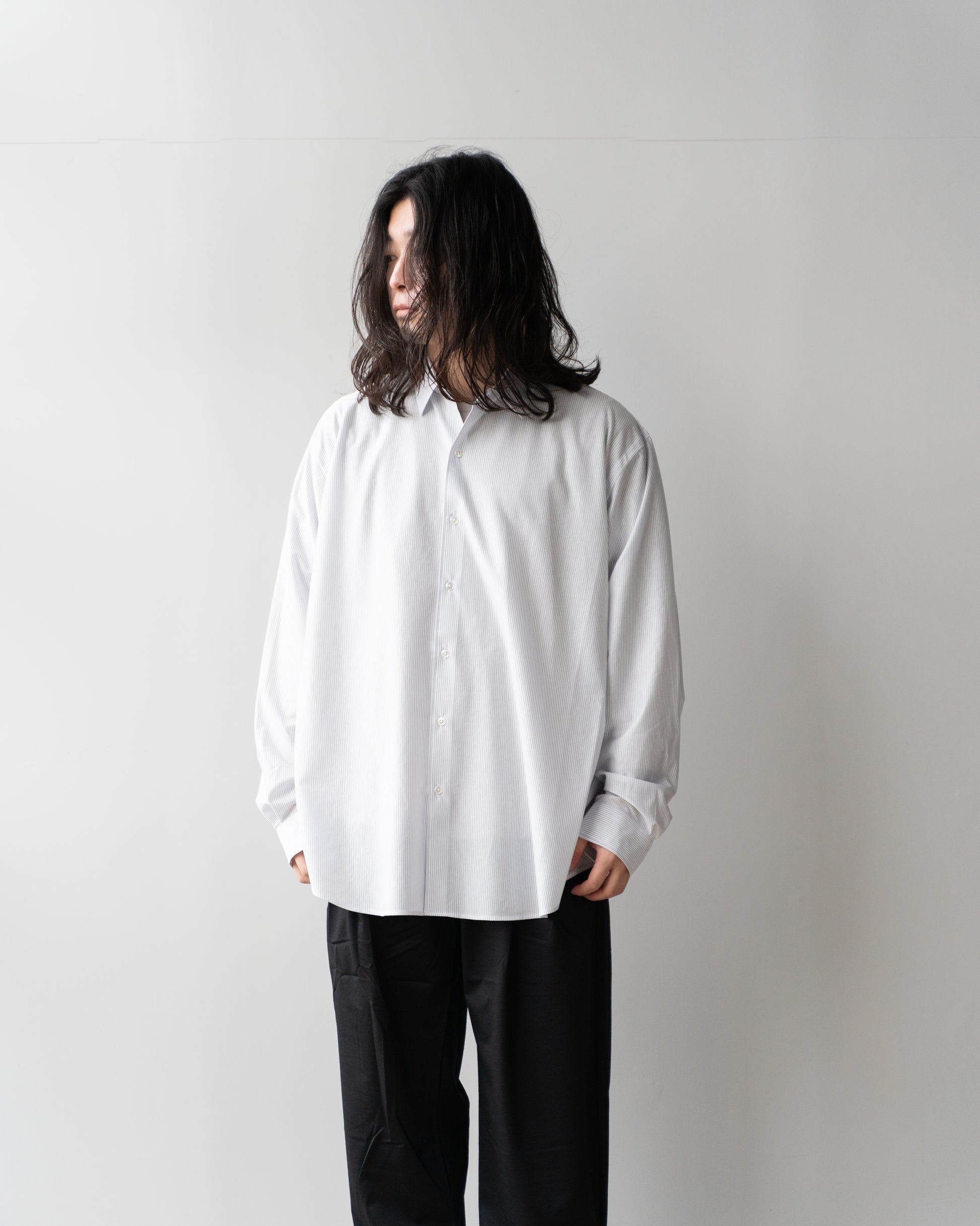 “atmosphere” 空気を纏うという名前の通り、 ゆったりとしたシルエット、素材の落ち感がわかりやすい定番シルエットのシャツです。46Gという、スーパーハイゲージで、タイプライターという織物の高密度平織組織を実現。 ストレッチ性が高く一度着ると止められない着心地、そして、着用時のしわなどの形態変化も少なく、イージーケア性も高い。 ハリ感、光沢感、イージーケアを持ち併せた我々にしかできないニュースタンダードシャツ地。