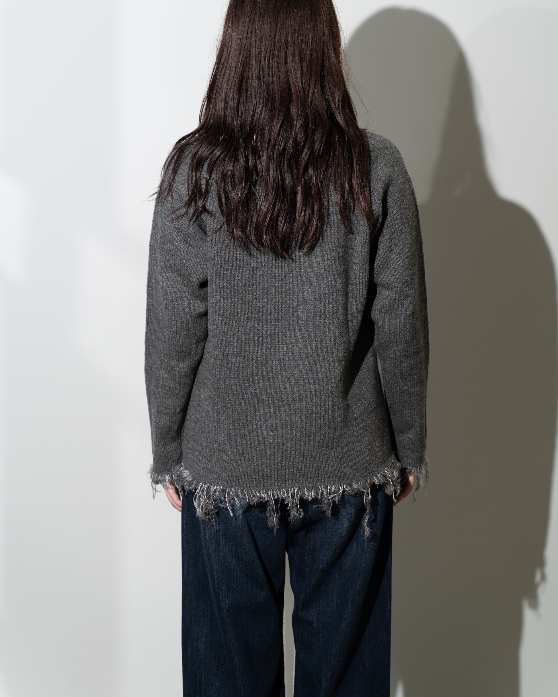 手作業で編む家庭機5Gの天竺編みをベースにフレイドヘム部を別で作成し、組み合わせ、カッティングして仕上げています。