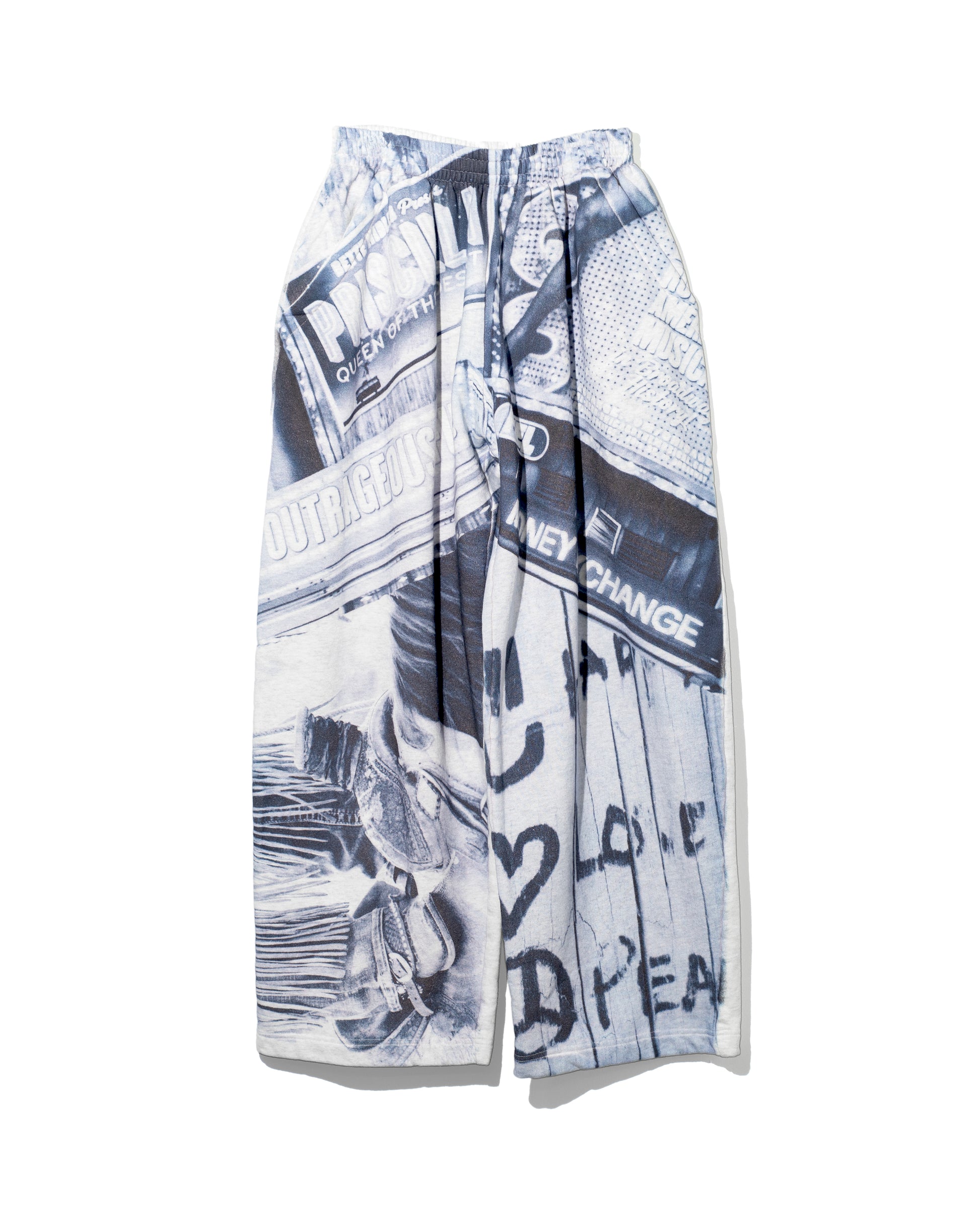 ホワイト杢の生地にニューヨークの街並みのモノクロ写真を前面にプリントしたスウェットパンツ。