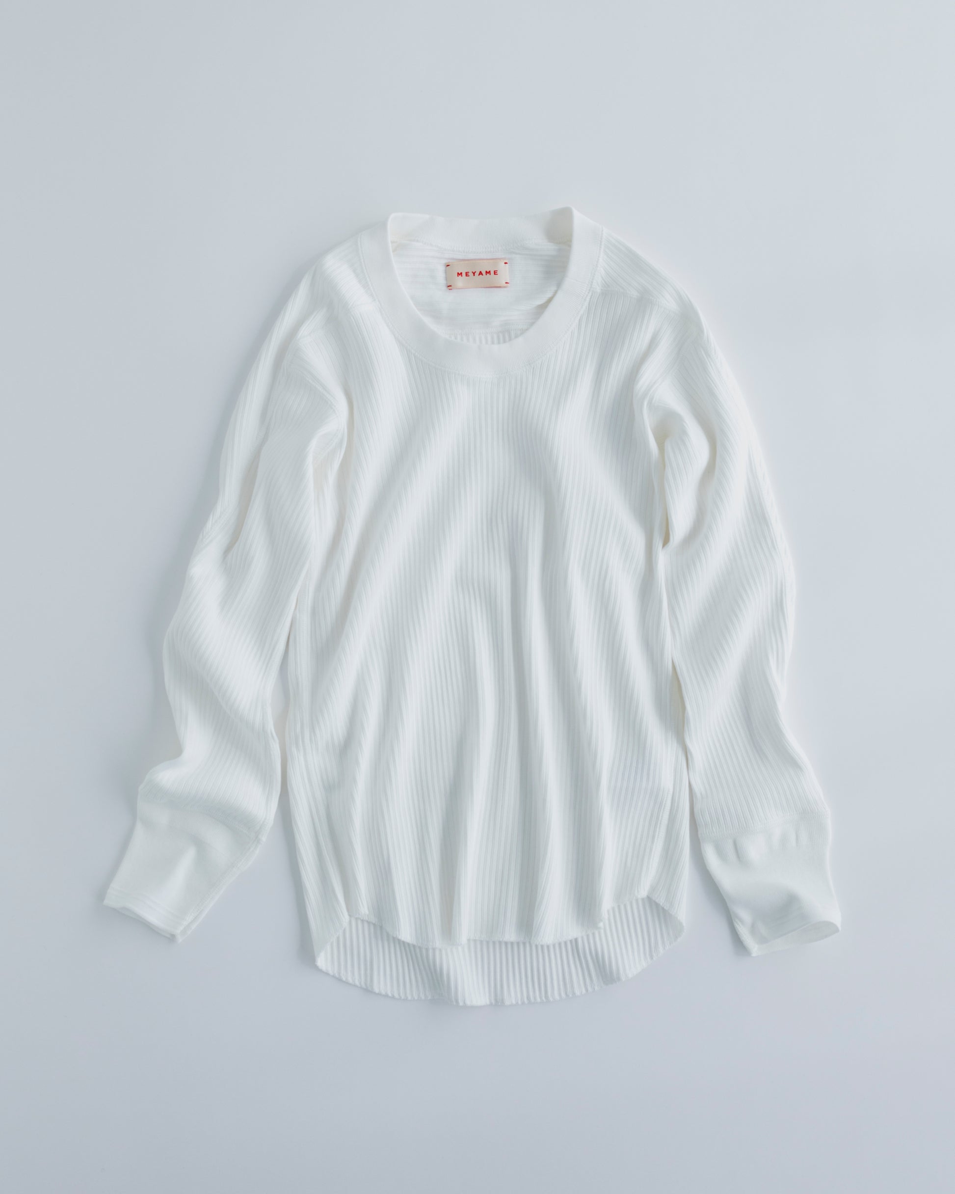 MEYAME の定番 OBLONG NECK RIB PULLOVER は、"カジュアルだけど女性らしい" MEYAME を一番表しているアイテムです。
