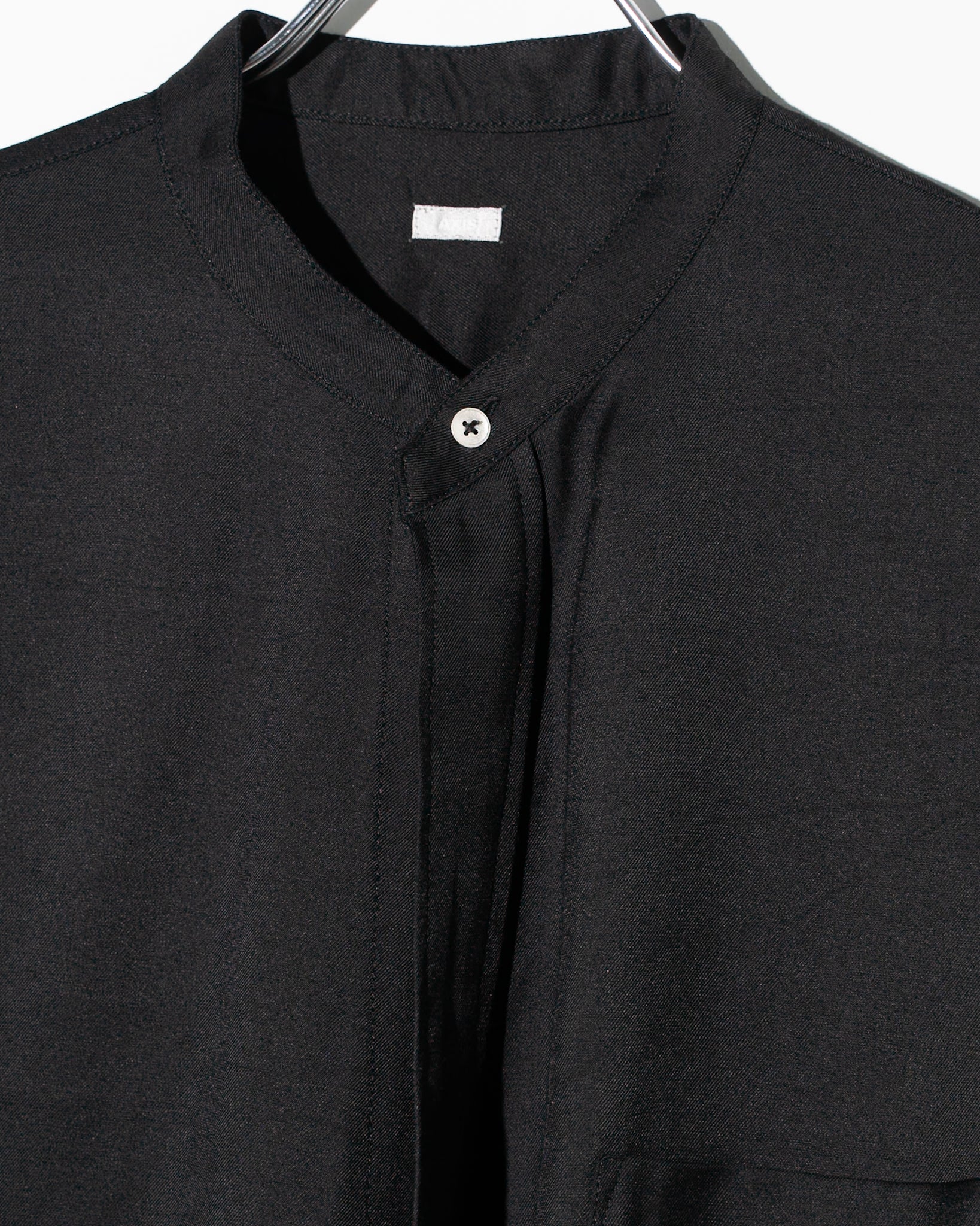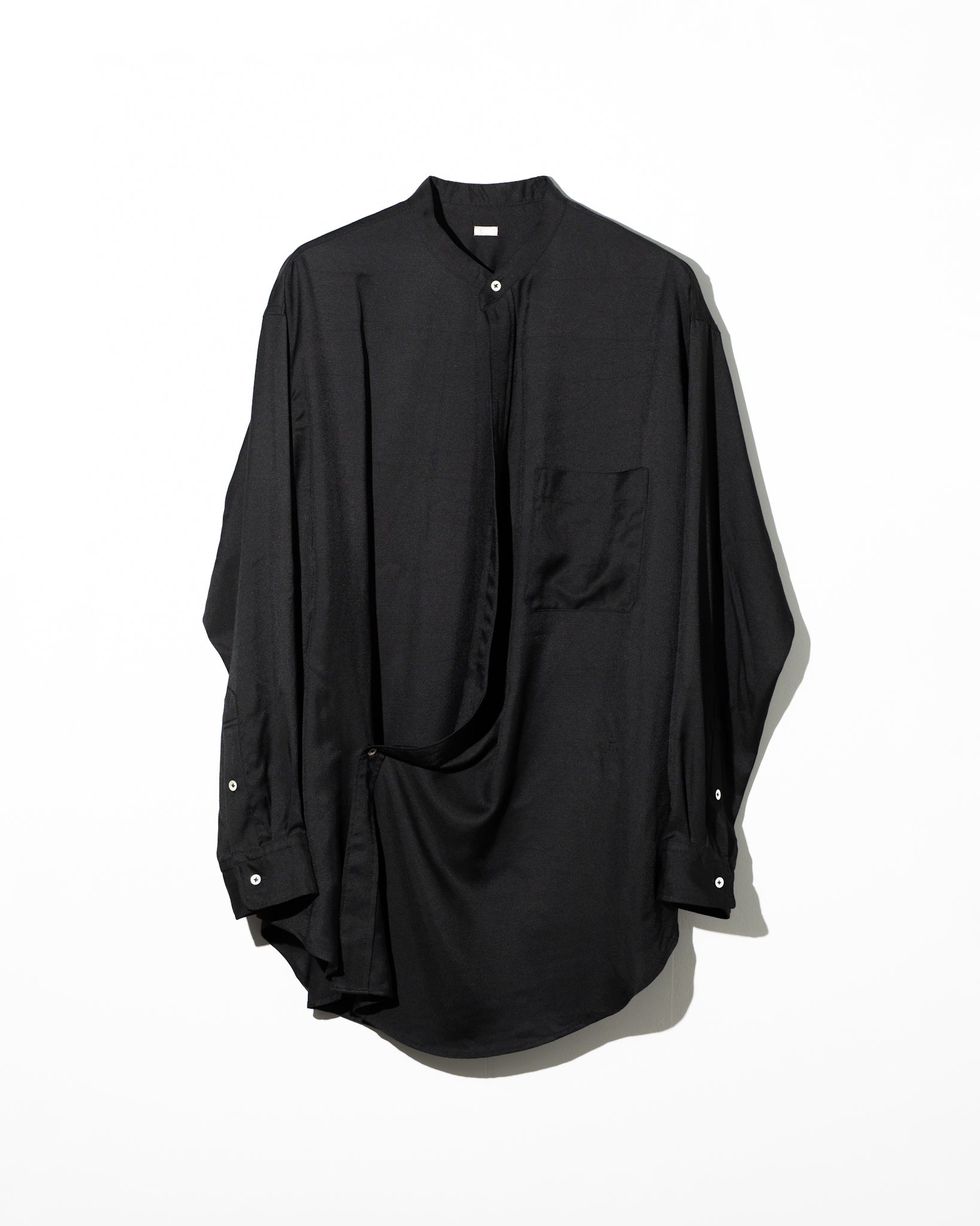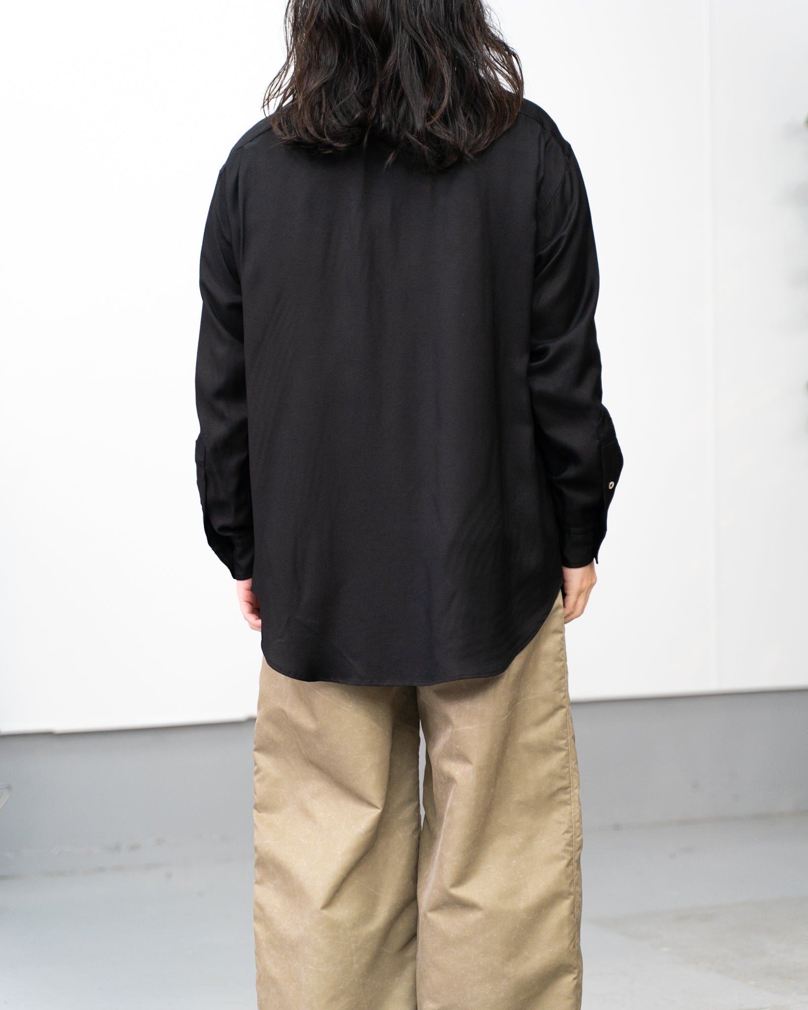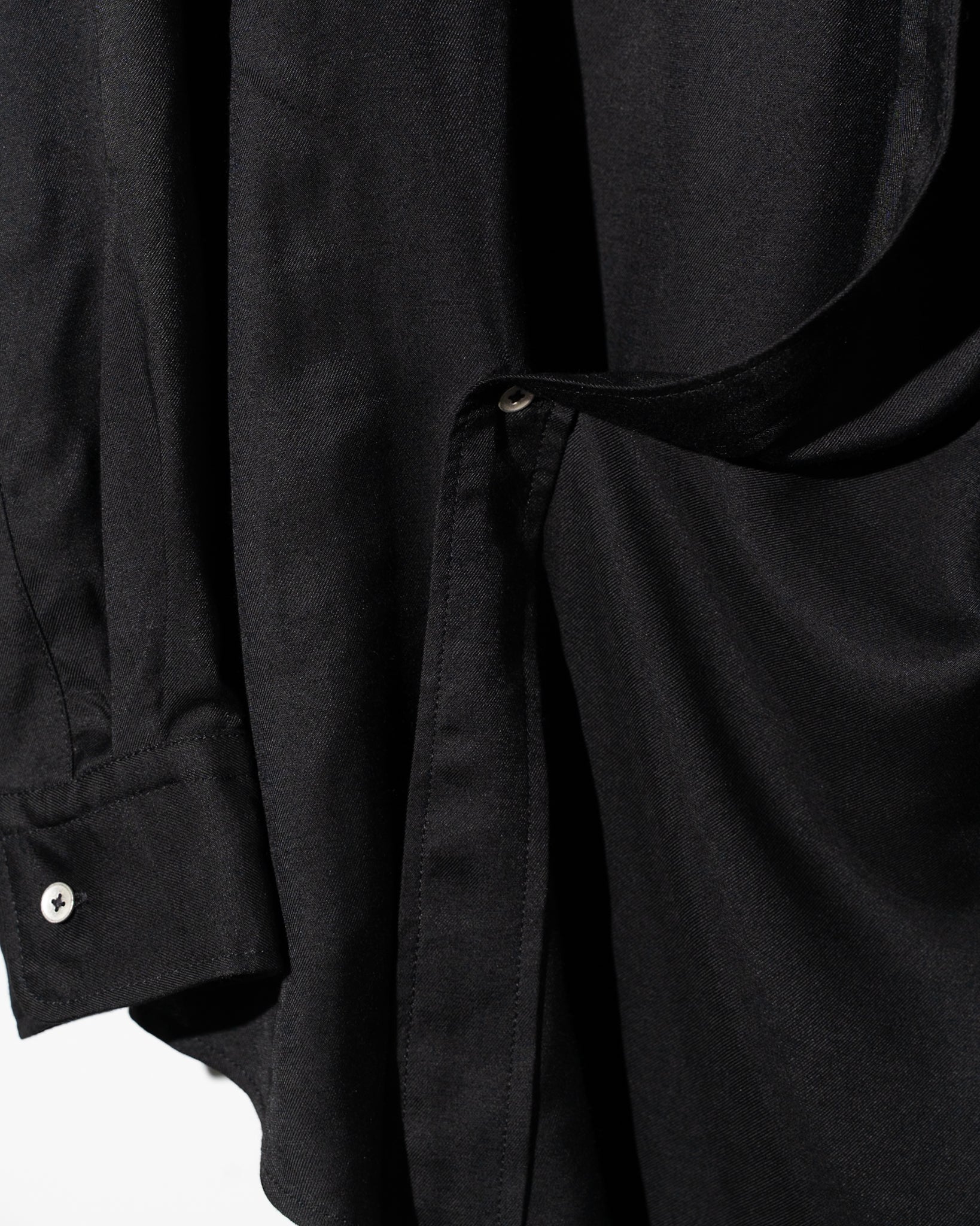 極上のとろみを持つビスコースレーヨンのツイル素材を贅沢に使用した、作務衣のような雰囲気のあるオーバーラップシャツ。 最大の特徴は、生地が重なり合うことで生まれる重厚なドレープ感です。歩くたびに空気を孕み、液体のように身体のラインを滑るそのシルエットは、ビスコース特有のしなやかさを最大限に引き出しています。