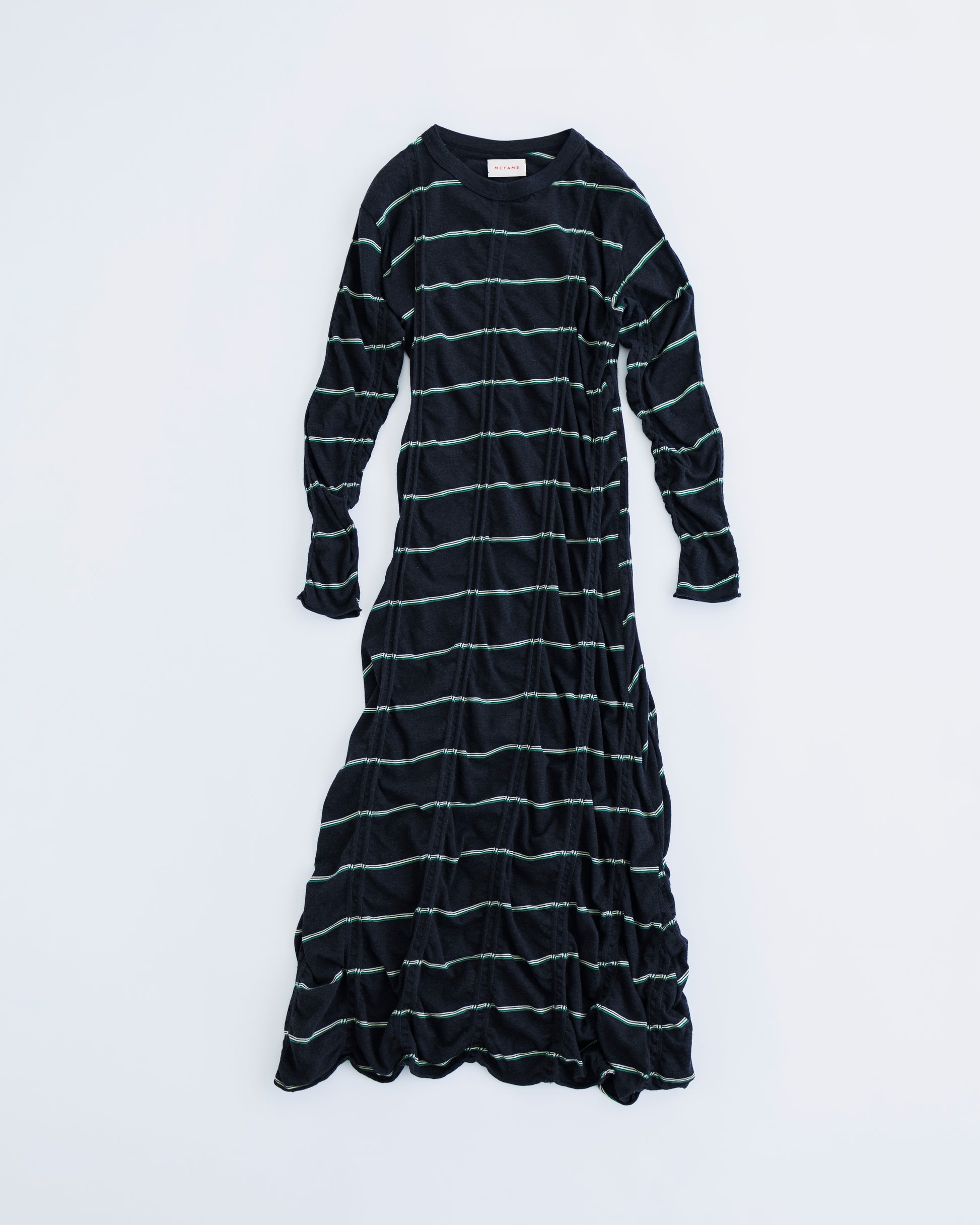 ボーダーを斜めになるよう斜行させ、縦に入ったジャガード部分とそれ以外の部分の対比で独特のシワ感を表現したこだわりのデザイン。
