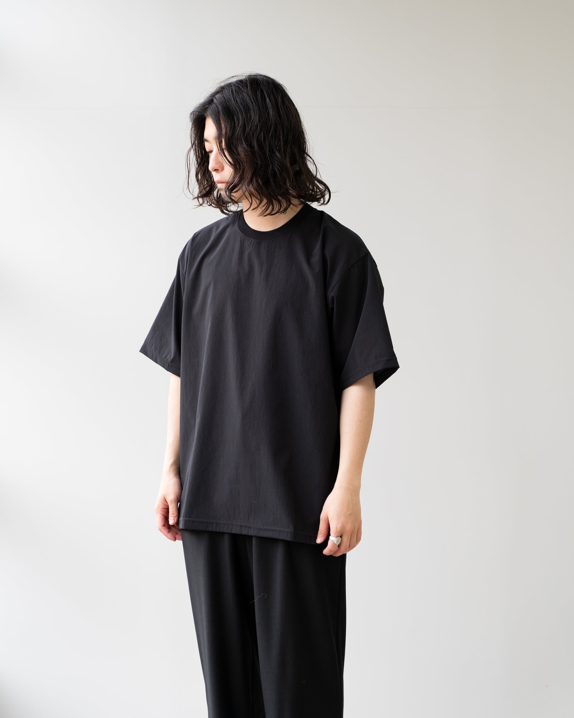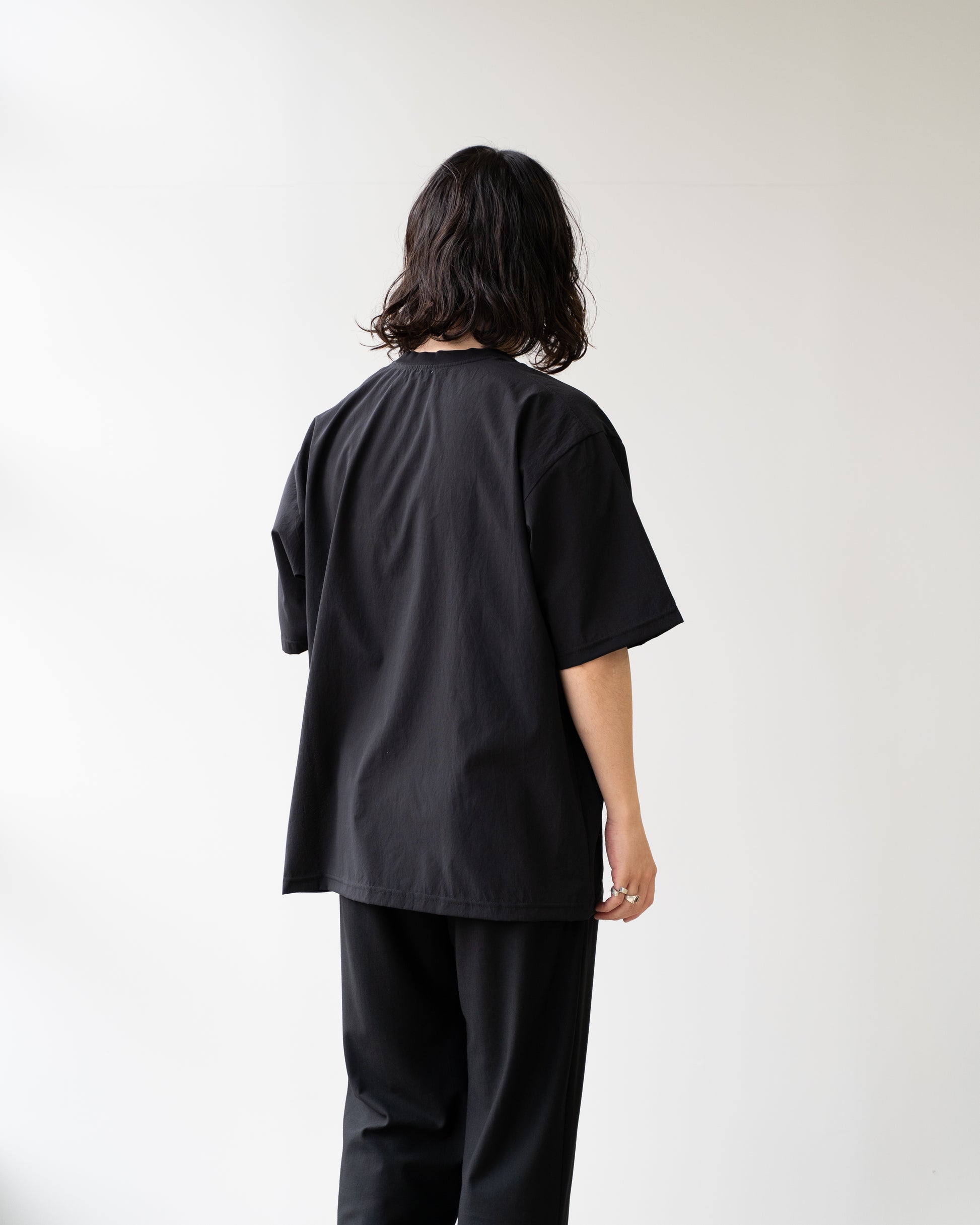 シルエットは肩に程よく落ちるバランスで、一枚でも、同素材のジャケットのインナーとしても最適。