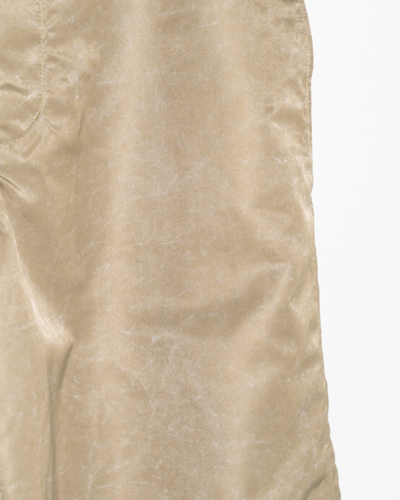 特有の表面感: 加工の特性上、生地表面には雫状の色ムラや濃淡が現れます。この不規則な表情こそが、量産品にはない「一点もの」のような奥行きと、ヴィンテージ特有の枯れた雰囲気を生み出しています。